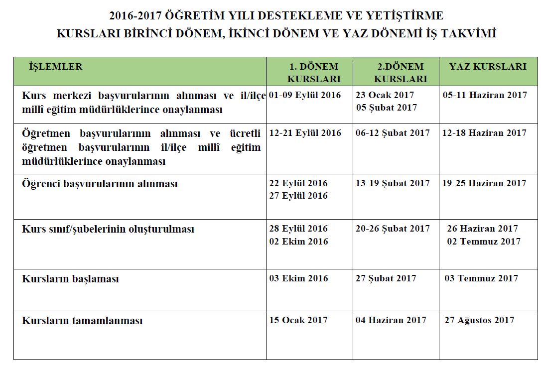 Destekleme ve Yetiştirme Kursları İş Takvimi 2016 - 2017